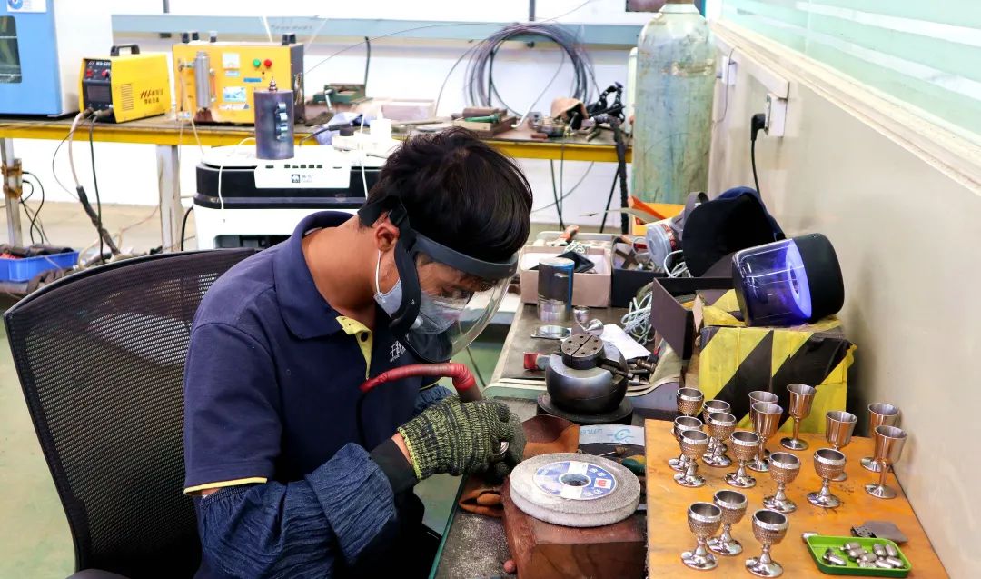 走进文创车间,机器运转声、打磨器具声不绝于耳,一片繁忙又欣欣向荣的景象。正在打磨器具的王国伟腼腆地向记者展示新生产的平安扣、戒指、飞行标志等三线文创产品。